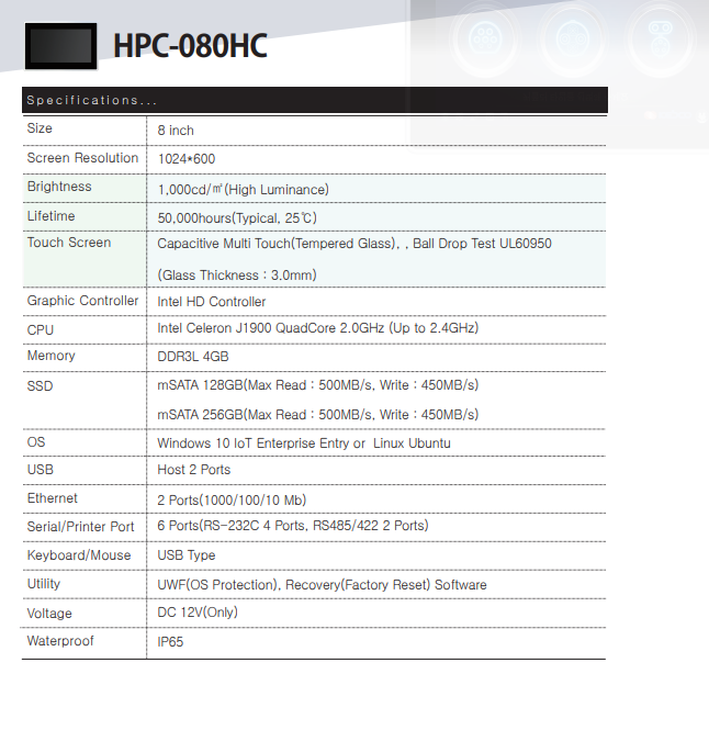 8" TouchPanel Capacitive, Intel Celeron J1900 2.0Ghz QuadCore