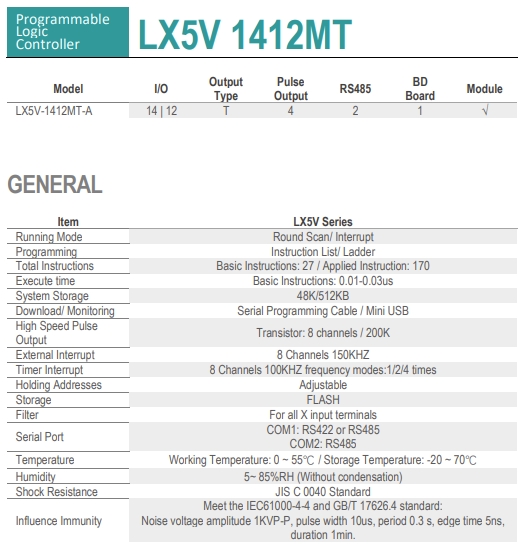 Faster: 0.01us~0.03us execution speed; Supports larger program capacity: 48,000 steps; Supports the highest baud rate: 921600; Supports 8 channels external interrupt, and support both rising and falling edges; Supports 100us high-speed timer interrupt; Supports up to 100 high-speed counting interrupts; Supports E-CAM; Supports electronic gear; Supports efficient and stable PID and CCPID self-tuning; Supports IO module and analog module of LX 3V series; Supports BD modules of LX 3V series (Communication BD module not supported now).